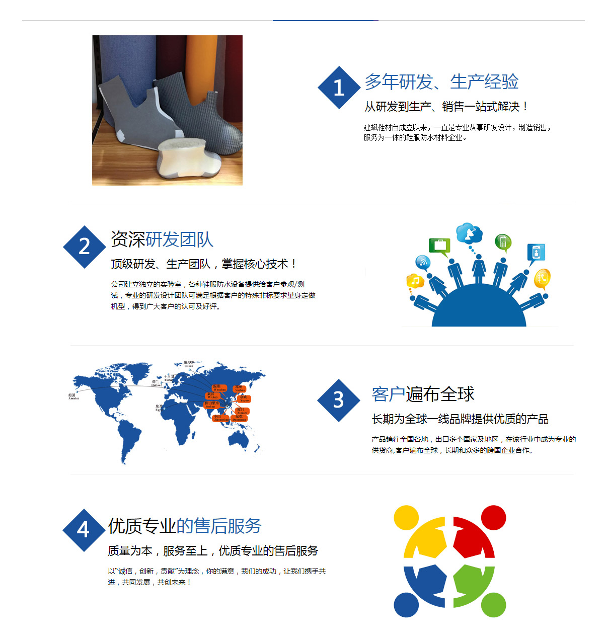公司生產的產品有:鞋服特殊功能性防水透氣材料;壓花太空層、紗賈等鞋用特殊材料;戶外徒步鞋、外貿雪地靴等需要防水功能的材料。擁有防水鞋設備、防水鞋工藝指導;飛織鞋面防水透氣納米技術處理;納米抗菌防臭、抗油污、抗靜電等功能性處理;承接防水鞋襪套全套加工、專業環保無溶劑PUR復合。復合好的成品具有耐高低溫、耐水洗、抗氧化、透氣、剝離強度強等功能。